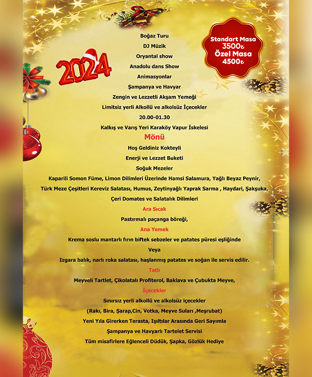 İncisu Boğaz Turu, 2024 yılbaşı gecesini unutulmaz kılacak bir deneyimle karşınızda! Karaköy Vapur İskelesi’nde başlayacak olan bu özel gece, sizlere İstanbul’un eşsiz güzelliklerini keşfetme fırsatı sunuyor.