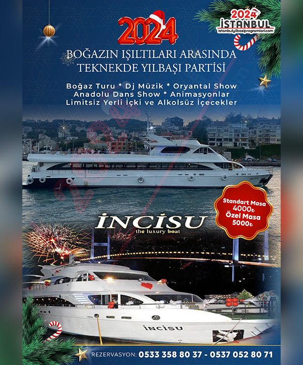 Rezervasyonlarımız hızla doluyor, bu benzersiz deneyimi kaçırmamak için yerinizi şimdiden ayırtın. İncisu Boğaz Turu, yeni yıla İstanbul’un ışıltılı manzarası ve keyif dolu anlarla birlikte adım atmanız için sizi bekliyor!