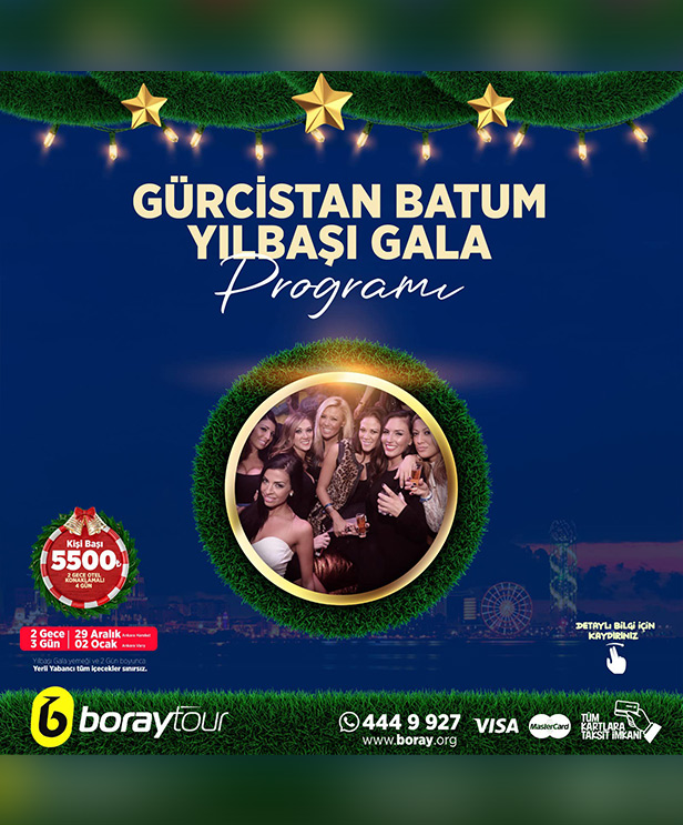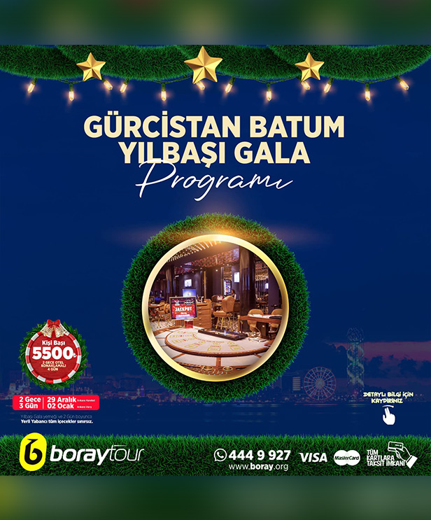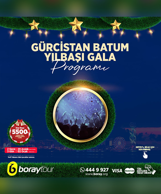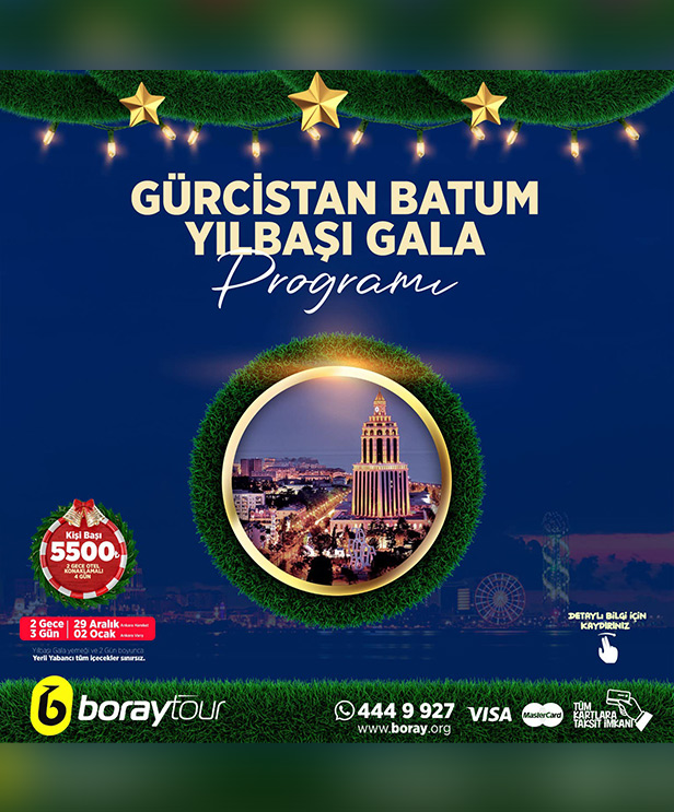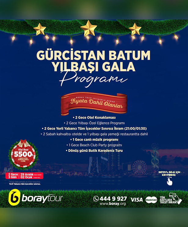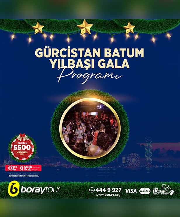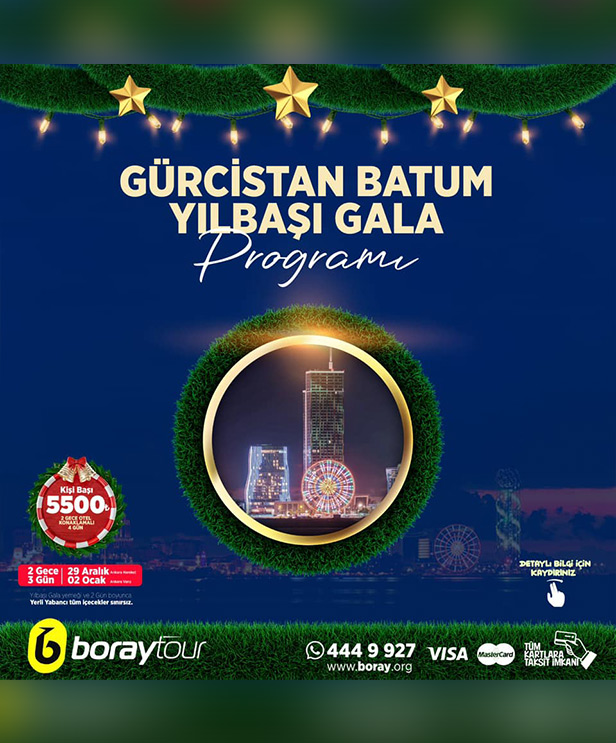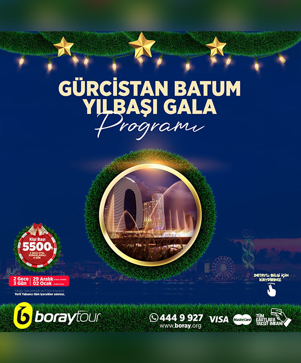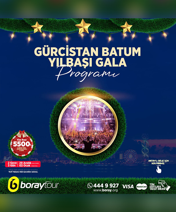 Batum’un büyüleyici atmosferinde, 2024 yılbaşını karşılamak için düzenlediğimiz özel programımız, unutulmaz bir deneyim sunuyor. Bu gece, renkli etkinlikler ve sürpriz dolu gösterilerle bezenmiş, hissedilen coşkunun doruklarına ulaşacağınız bir kutlama vaat ediyoruz. Batum’un eşsiz güzellikleriyle çevrili, özenle seçilmiş detaylarla süslenmiş bu özel programda, 2024’e sevdiklerinizle birlikte unutulmaz bir başlangıç yapmak için sizleri bekliyoruz. İstanbul çıkışlı Batum turunda siz de hemen yerinizi alın!